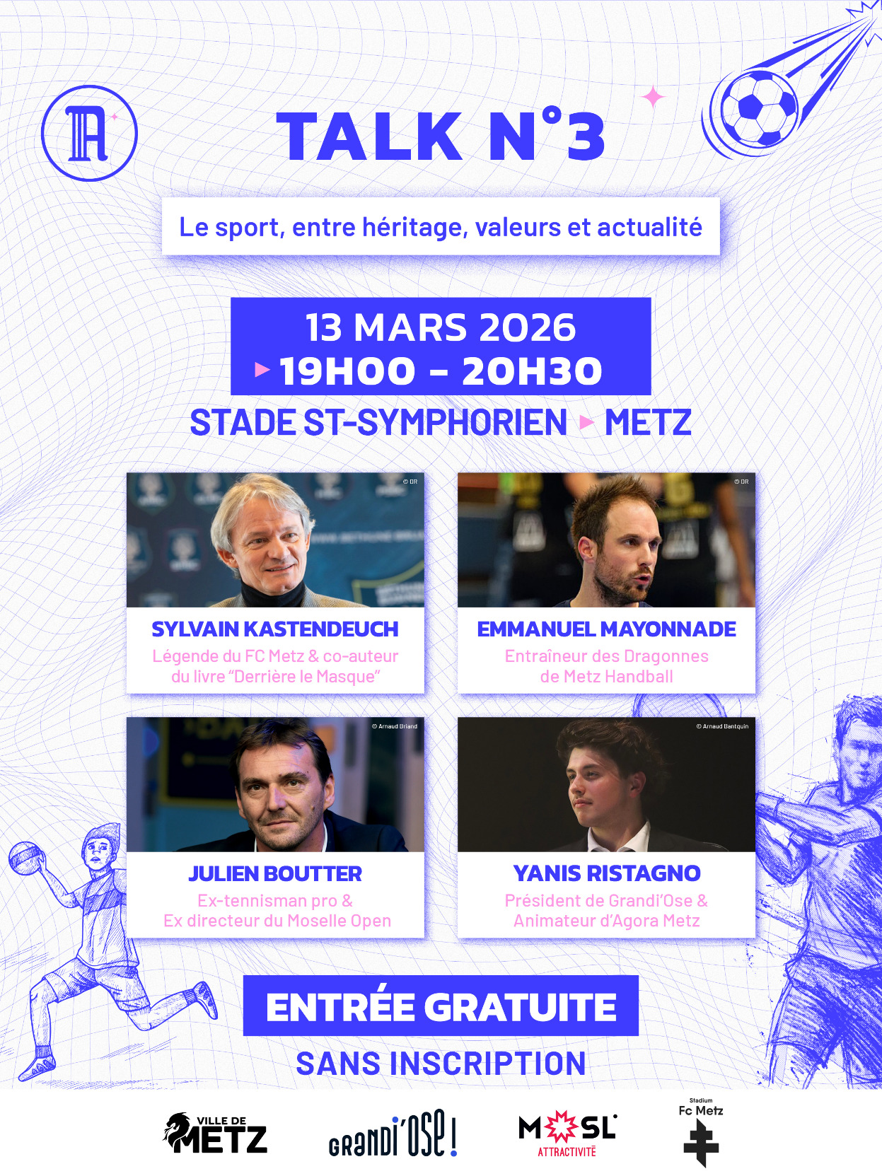 Pour sa troisième édition, Agora Metz investit un lieu emblématique du territoire : le FC Metz. Ce talk citoyen, imaginé et animé par le jeune messin Yanis Ristagno, 17 ans, propose une rencontre originale entre personnalités reconnues et public autour des grandes thématiques de notre société.