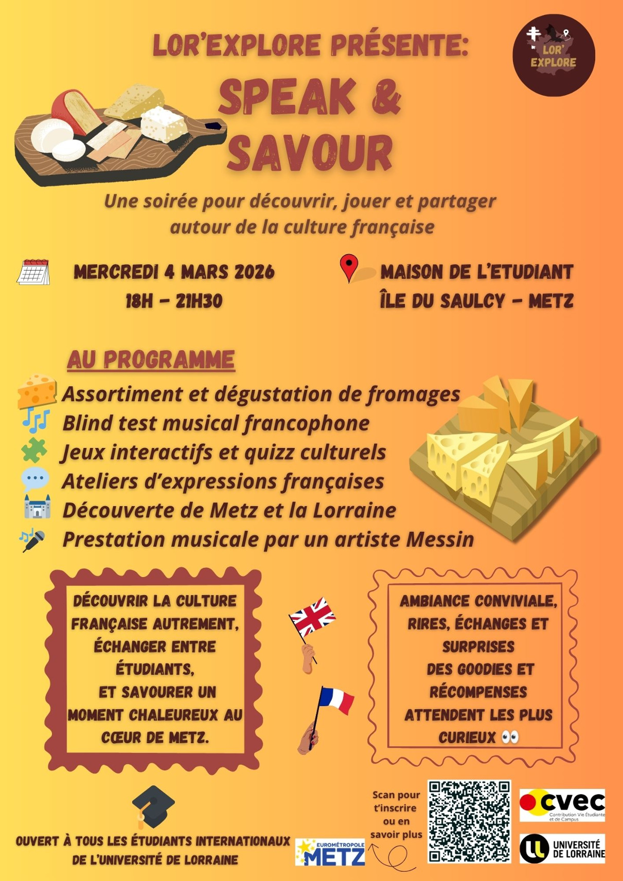 Lor’Explore Speak and Savor est un cycle de 6 soirées étudiantes gratuites, dédiées à la découverte du patrimoine culturel et gastronomique de Metz et de la Lorraine à travers des animations bilingues, des dégustations de spécialités locales et la rencontre avec musiciens et artisans du territoire. L’objectif principal est de stimuler l’intégration, l’inclusion, la convivialité et l’échange entre étudiants internationaux et français de toutes filières et tous campus en valorisant la richesse régionale.