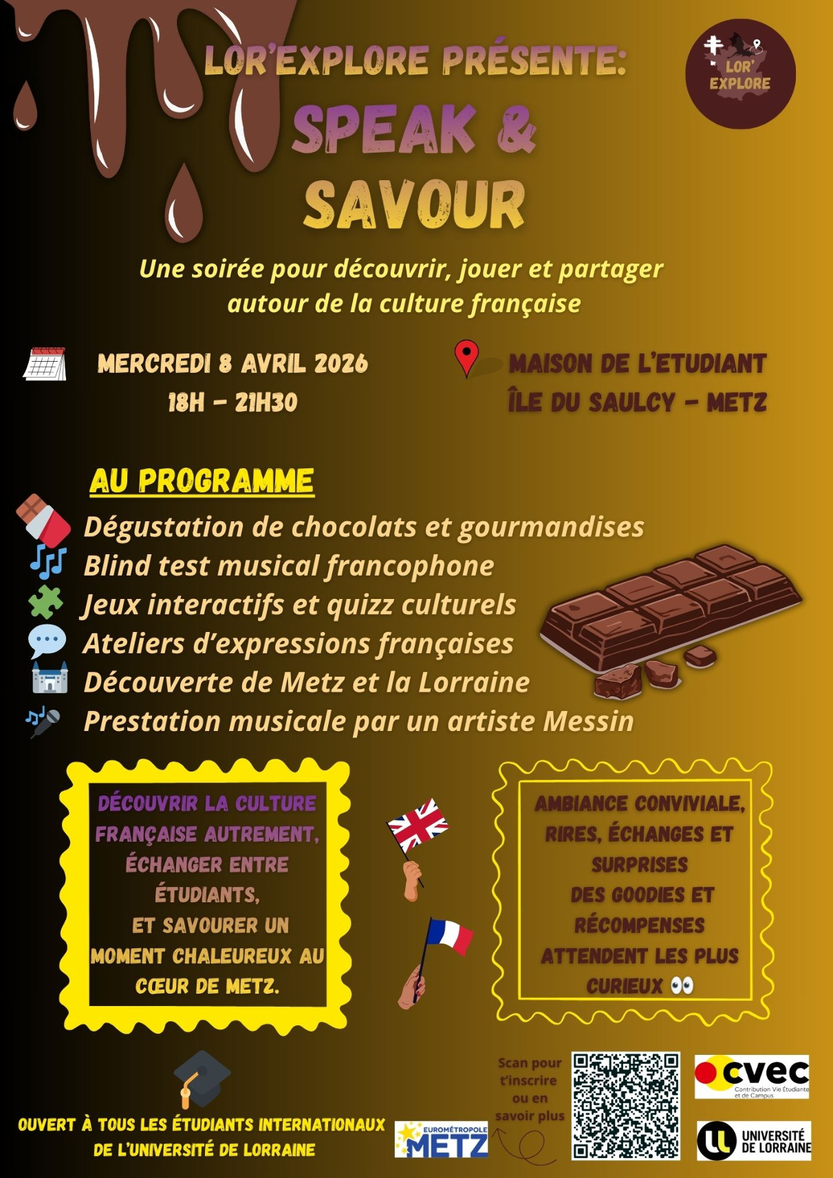 Lor’Explore Speak and Savor est un cycle de 6 soirées étudiantes gratuites, dédiées à la découverte du patrimoine culturel et gastronomique de Metz et de la Lorraine à travers des animations bilingues, des dégustations de spécialités locales et la rencontre avec musiciens et artisans du territoire. L’objectif principal est de stimuler l’intégration, l’inclusion, la convivialité et l’échange entre étudiants internationaux et français de toutes filières et tous campus en valorisant la richesse régionale.