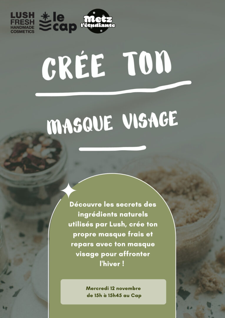 Tu pourras découvrir les secrets des ingrédients naturels utilisés par Lush et créer ton propre masque frais et repartir avec ta préparation !
