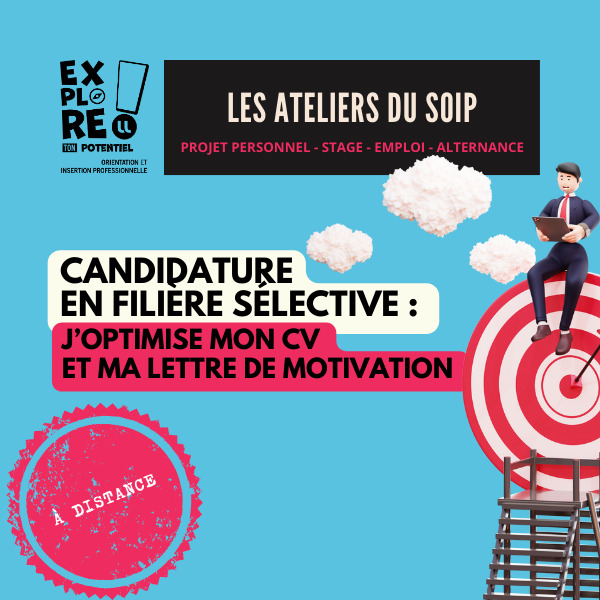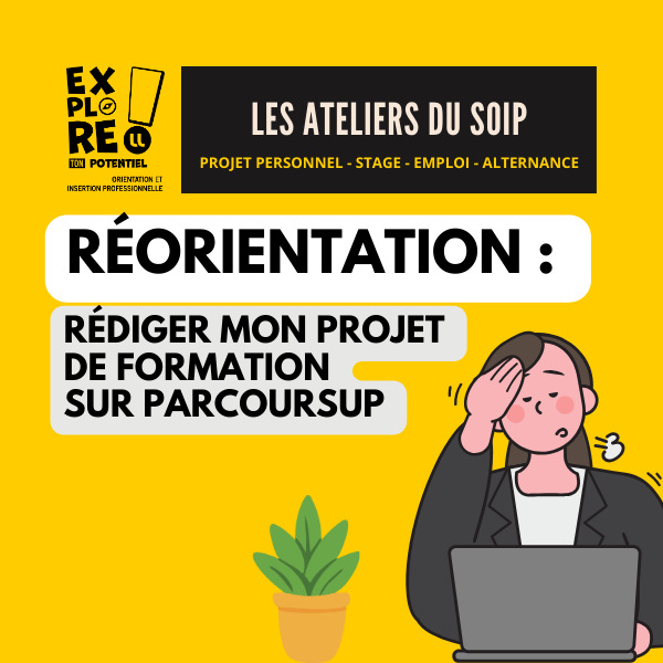Alors, ne manquez pas cet atelier, accessible à distance (via Teams) dont l’objectif est de vous apprendre à rédiger de façon concise et percutante votre projet de formation et professionnel sur Parcoursup, en sachant mettre en avant vos motivations, votre profil, votre parcours et votre connaissance de la formation ciblée.