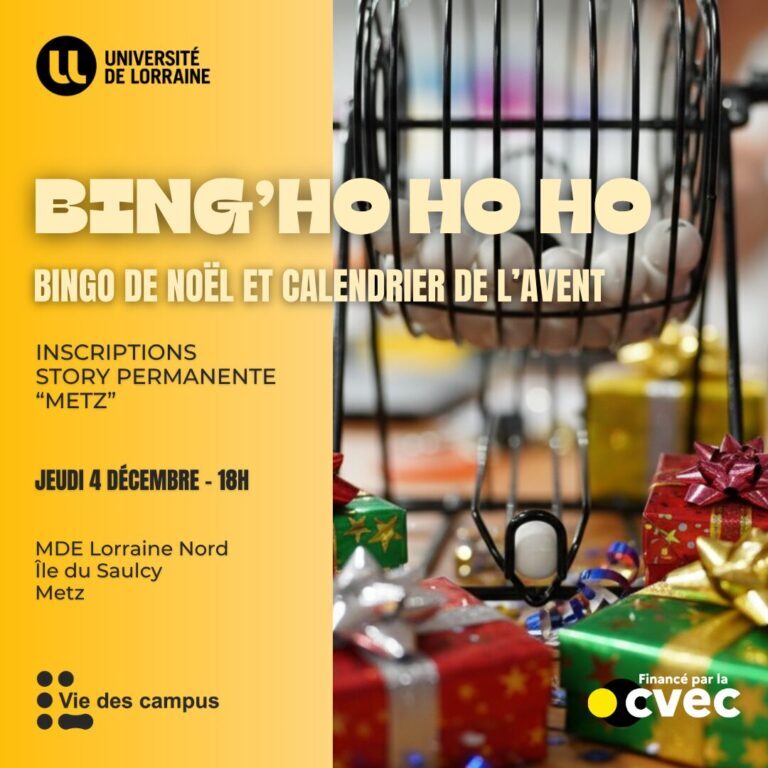 C’est bientôt la fin de l’année et ta MDE te réserve plein de belles surprises. Viens tenter ta chance lors de notre Bing’Ho Ho Ho, un moment festif placé sous le signe de la bonne humeur et de la convivialité ! Les plus chanceux d’entre vous pourront ouvrir les cases de notre calendrier Bingo remplies de surprise et de cadeaux !