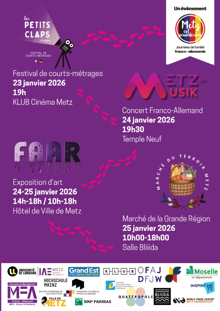 Le festival Les petits claps met à l'honneur le cinéma franco-allemand en offrant une plateforme unique aux étudiants, amateurs et professionnels pour découvrir des courts-métrages innovants issus de divers horizons culturels. Véritable célébration de la diversité artistique et du partage culturel, ce festival unique propose une soirée inoubliable dédiée à la découverte et à la créativité, au cœur de la Grande Région. Cinéphiles, talents émergents et passionnés de cinéma sont les bienvenus pour vivre une expérience mémorable.