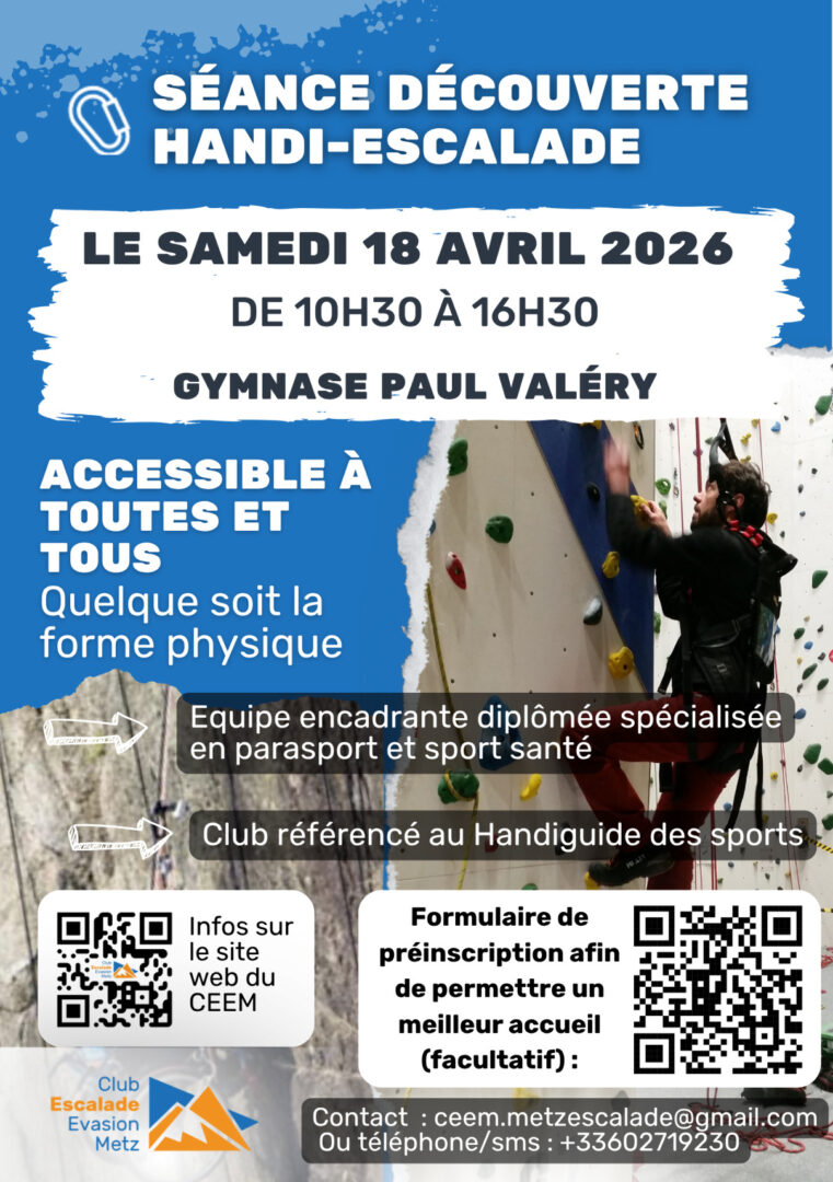 L'activité est accessible à toutes et tous, quelque soit la forme physique et/ou le handicap. Des ateliers découverte, grimpe guidée et progression verticale assistée seront organisés. Le CEEM, référencé au Handiguide des sports vous accompagne dans la découverte de l'activité grâce à une équipe encadrante diplomée et propose également des cours de paraescalade, sport santé et sport adapté tout au long de l'année.